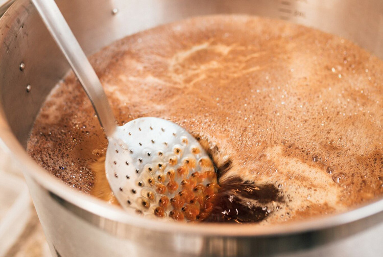 Il faut chauffer de l’eau à 70°C-75°C sur votre brûleur ou plaque chauffante. Ajoutez ensuite votre malt. Mélangez au fourquet jusqu’à obtenir une texture homogène sans grumeaux (gruau). La température idéale de l’empâtage doit se situer entre 63 et 68°C pendant toute la durée de cette étape (45 minutes à 1 heure). Il faut alors laissez reposer votre mélange (“moût”) pendant une heure en conservant la température. Attention, n’oubliez pas de remuer régulièrement si vous avez laissé le feu allumé ! Une fois l’heure écoulée, augmentez la température à 77°C – sans brûler la préparation – pour tuer les enzymes (ce qu’on appelle le palier enzymatique).